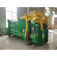 2、设备从地坑升起后与自卸式垃圾车对接,并将垃圾推入自卸式垃圾车内。